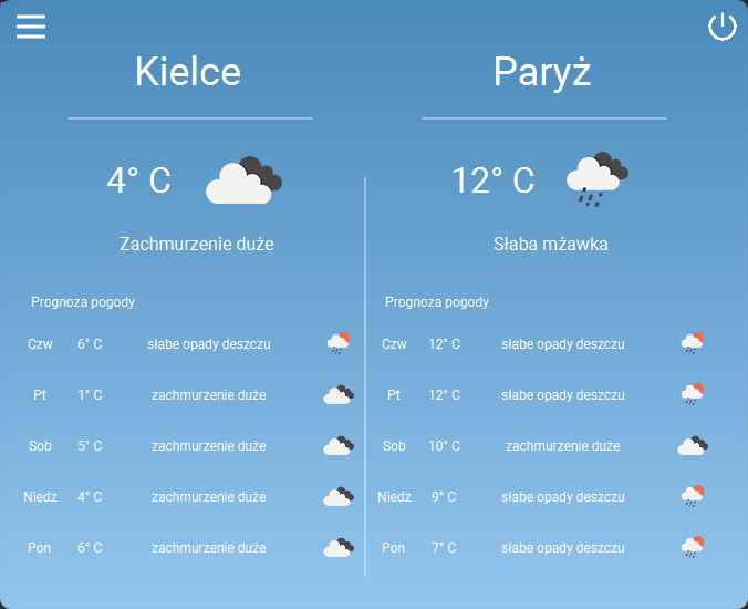 Aplikacja pogodowa prezentująca dzisiejszą pogodę, a także prognozę na kolejne 5 dni dla dwóch wybranych miast. Napisana w języku Java, z praktycznym wykorzystaniem wzorców projektowych. Aplikacja posiada testy jednostkowe utworzone przy pomocy narzędzi JUnit oraz Mockito.