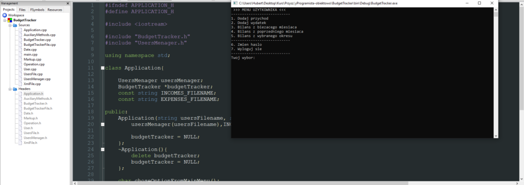 Program konsolowy do zarządzania budżetem osobistym obsługujący wielu użytkowników, napisany w języku C++ w paradygmacie obiektowym.